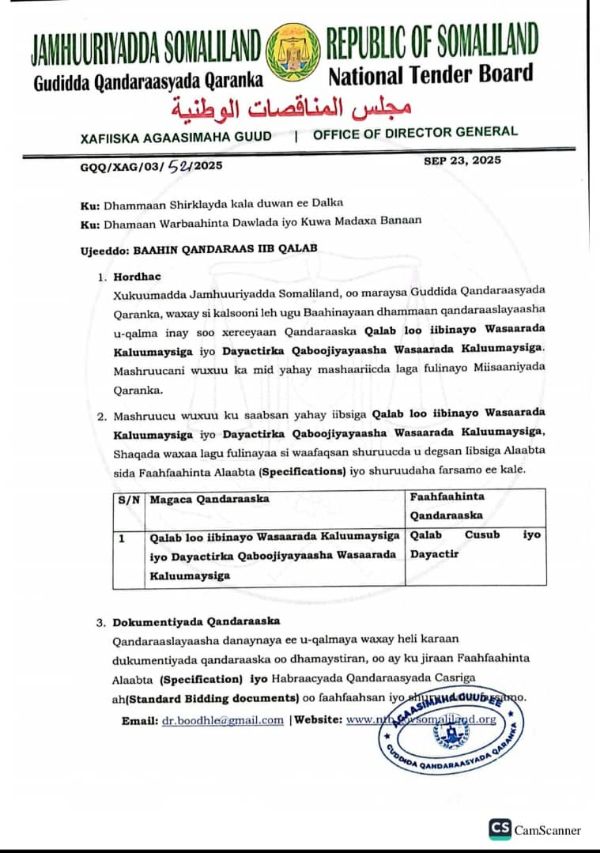 Hargeysa[17-09-2025] waxay Guddida Qandaraasyada Qaranka JSL ay fureen Hal mashruuc oo in muddo ah baahintiisu ka socotay Warbaahinta kala duwan ee dalka.Mashruucaas oo ahaa Qandaraas dhisme cusub oo noqonaya xarun shaybaadh kaas oo hay'ada dhawrista Tayada looga dhisayo magalada berbera, waxaa laga maalgelinayaa Miisaaniyadda Qaranka ee JSL Ee 2025.
